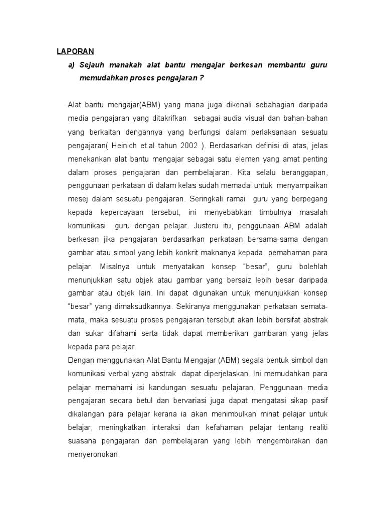 Pengenalan Definisi ABM Alat bantu mengajarABM yang mana juga dikenali sebahagian daripada media pengajaran yang ditakrifkan sebagai audia visual dan bahan-bahan yang berkaitan dengannya yang berfungsi dalam perlaksanaan sesuatu pengajaran Heinich etal tahun 2002. Alat bantu mengajar ABM membekalkan satu dasar untuk perkembangan pembelajaran murid dan menjadikan pembelajaran mereka lebih kekal. Menurut Atan Long 1981 menyatakan bahawa bahan bantu mengajar terdiri kepada tiga kumpulan iaitu alat pendengaran alat pandangan dan juga alat pandang-dengar.