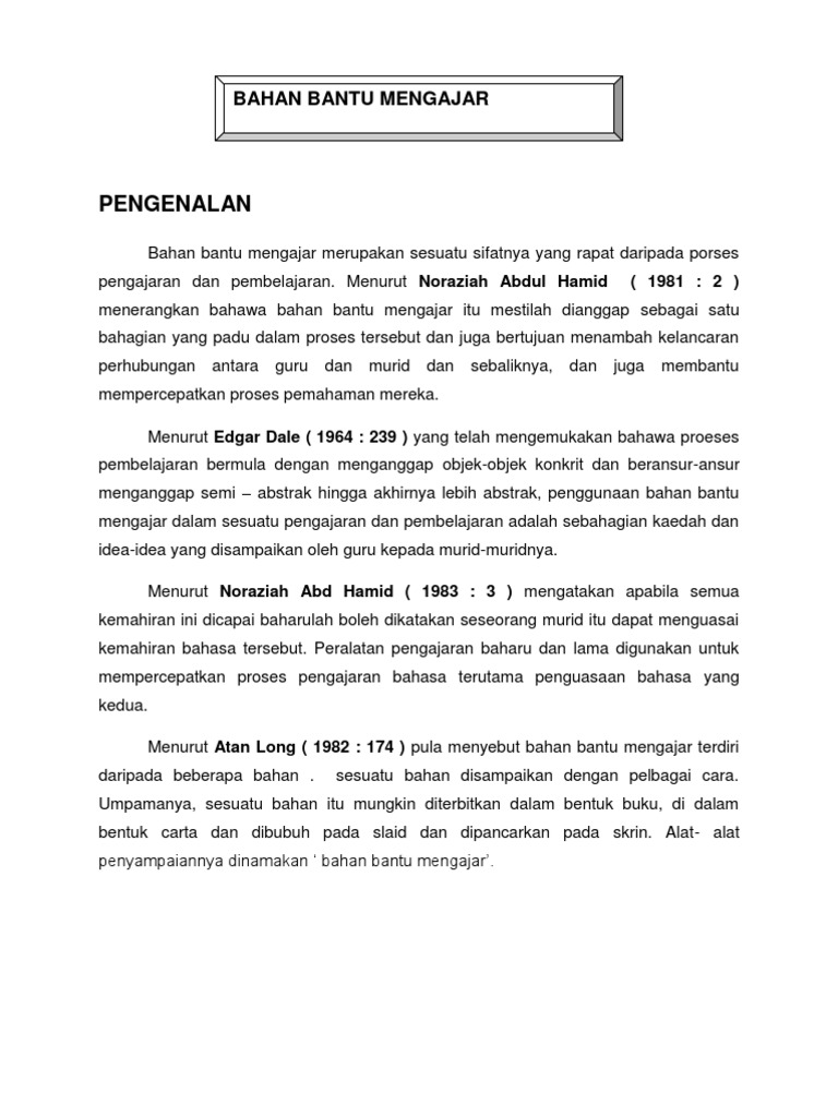 Bahan bantu mengajar bukan hanya terhad kepada buku teks papan tulis kapur dan gambar-gambar sahaja tetapi ia. Alat bantu mengajar merangkumi semua bahan yang boleh dilihat dipegang dibaca dirasa dihidu dan sebagainya. Berdasarkan definisi di atas jelas menekankan alat bantu mengajar sebagai satu elemen.